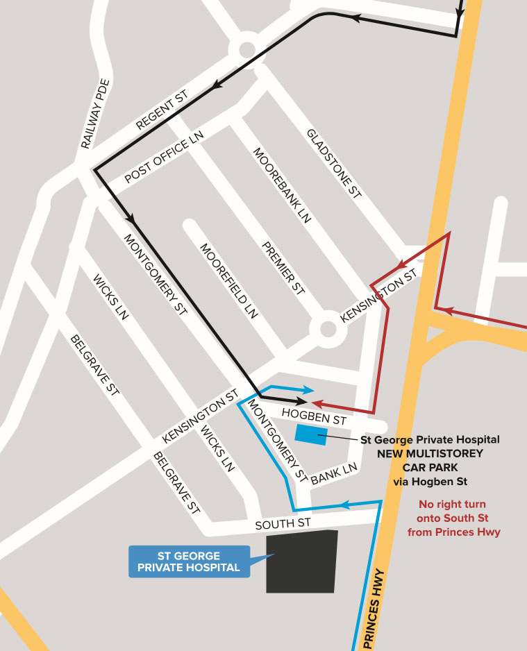 Entry to these new facilities can be found via Hogben Street in Kogarah, please see the map below for details. Please note that all disabled parking will continue to be available in the original car park which is located directly underneath the hospital, entry via South Street.